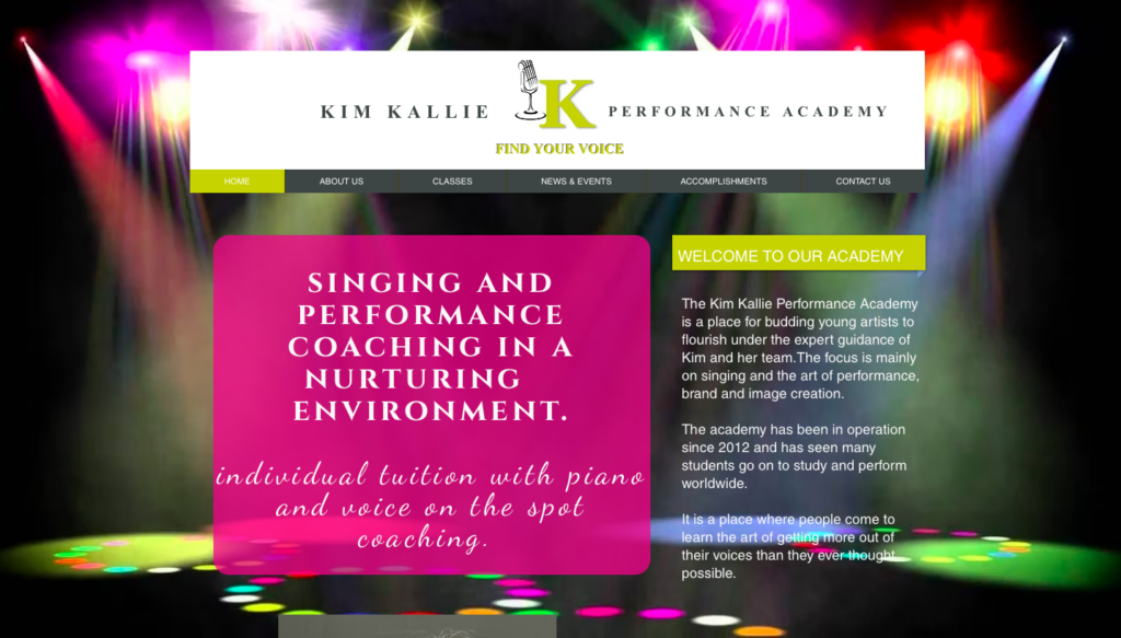 - This website immediately lets you know its purpose. Viewers quickly understand that it is marketing a singing and performance academy. Furthermore, the picture of Kim Kallie on the main page and information about her musical journey on other pages adequately reveal who oversees the company. However, the site could do a better job of answering probable questions viewers might have, such as whether the academy is based at a specific school, studio, or primarily online. Each page contains a ton of text but comparatively answers few questions. A Q&A page might be an effective addition to solve this problem.