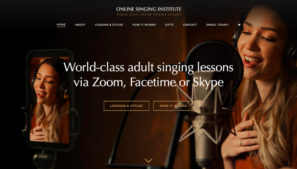 - The overall design of Online Singing Institute is classic and elegant. The warm brown tones and sophisticated font choices found throughout the website provide a strong sense of unity and cohesion. With a clearly defined, unified purpose and easy navigation, this website effectively markets the company’s online singing lessons.